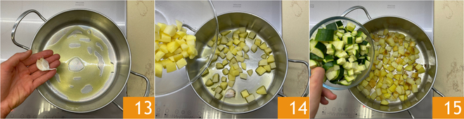 En una olla, vierte el aceite y el ajo 13, calienta durante unos minutos, luego añade las patatas 14 y saltéalas durante 10 minutos. En este punto, añade los calabacines 15.