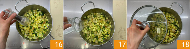 Sofríe durante otros 5 minutos, luego elimina el ajo y ajusta de sal y pimienta 16. Vierte el agua 17, baja el fuego, cubre con una tapa 18 y cocina durante unos 15 minutos o hasta que las verduras estén tiernas.
