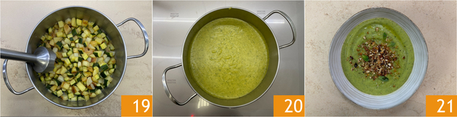 Tritura todo con una batidora de inmersión 19 para obtener una consistencia cremosa 20. Sirve y decora con el pan rallado y las almendras. ¡La crema de calabacín y patatas está lista para ser disfrutada 21!