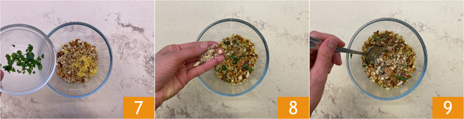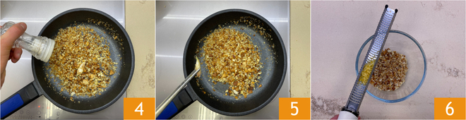 Ajusta de sal 4, elimina el ajo 5 y transfiere todo a un bol, luego deja que se enfríe un poco. Aromatiza el pan rallado con la piel de limón 6.