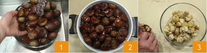 Para preparar la crema de castañas comienza lavando las castañas bajo el agua corriente 1, luego colócalas enteras en una olla llena de agua y hiérvelas durante al menos 15 minutos 2, después escúrrelas y déjalas templar. En este punto pela las castañas con un cuchillo afilado 3.