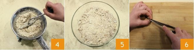 Transfiere las castañas al pasapurés 4 para obtener una mezcla arenosa 5 o, alternativamente, puedes usar un prensador de patatas. De esta manera obtendrás aproximadamente 1,6 kg de pulpa. Ahora toma la vaina de vainilla, hazle un corte a lo largo 6