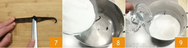 y extrae las semillas internas 7. Pon al fuego una cacerola de borde alto, añade la vaina de vainilla con sus semillas, el azúcar 8 y el agua 9.