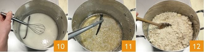 Derrite el azúcar a fuego medio, mezclando con un batidor durante unos 10 minutos 10. Cuando el azúcar esté totalmente disuelto, elimina la vaina de vainilla con unas pinzas de cocina 11 e incorpora las castañas 12 y mezcla el compuesto.