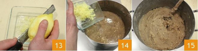 Ralla la cáscara de un limón no tratado 13 y agrégala a la crema 14. Cocina a fuego bajo durante aproximadamente 1 hora, revolviendo de vez en cuando con una cuchara de madera. La crema de castañas estará lista cuando se convierta en un puré cremoso 15.