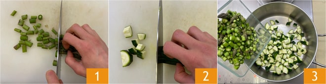 Para preparar la crema de espárragos y calabacines con quinoa, lo primero que hay que hacer es Cómo limpiar los espárragos. Elimina la parte más leñosa del tallo y córtalos en trozos de aproximadamente 1 cm 1. Quita las puntas y corta los calabacines primero en rodajas y luego en cubos de 1 cm 2. Coloca las verduras en una olla 3.