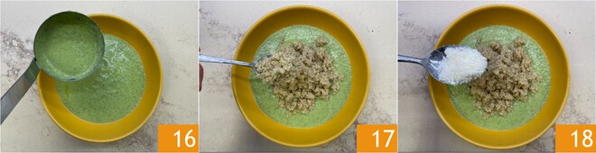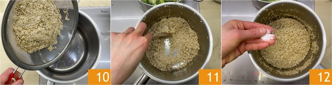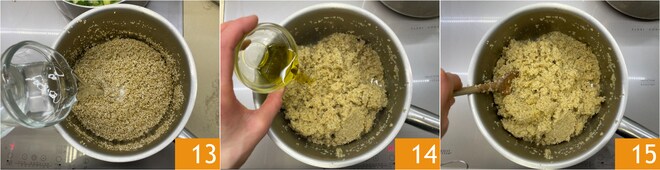 Agrega agua 13 y continúa cocinando dejando hervir el agua a fuego medio-bajo. La quinoa estará lista cuando haya absorbido toda el agua, tardará unos 20 minutos. Al final de la cocción, añade el aceite 14 y luego desgrana la quinoa 15.