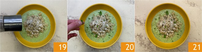 Continúa con una pizca de pimienta negra 19, tomillo y algunas hojas de albahaca 20. Tu crema de espárragos y calabacines con quinoa está lista para ser servida 21.