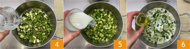 Añade el agua 4 y cocina, a fuego medio, durante unos 10-15 minutos desde que empiece a hervir. Una vez cocidas, añade la leche 5 y el aceite 6.