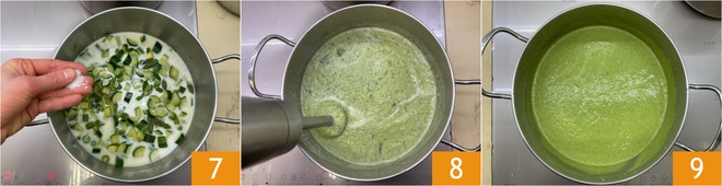 Sal al gusto 7 y tritura con la batidora de inmersión 8 hasta obtener una crema suave y homogénea 9. Reserva.
