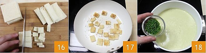 Mientras tanto, preparad los picatostes, eliminando la parte oscura de los lados de las rebanadas de pan de molde y cortando las rebanadas en tiras y luego en cuadraditos bastante pequeños, de unos 1,5 cm de lado 16. Calentad una sartén antiadherente en el fuego y luego verted los trozos de pan de molde dentro; dejad que se doren en el fuego por ambos lados durante un minuto 17. Volved a poner la crema de espárragos y patatas al fuego y añadid el cebollino picado 18.
