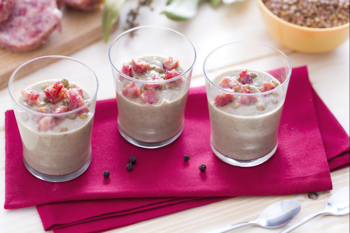 La crema de lentejas con dados de cotechino crujiente es una idea simpática e innovadora para sorprender a vuestros invitados proponiendo una manera insólita de comer el Cotechino con lentejas el día de Nochevieja, quizá reutilizando los ingredientes que sobraron la noche anterior.