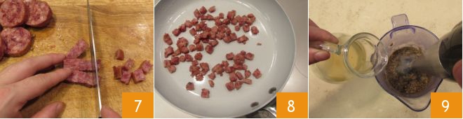 Cuando las lentejas estén casi cocidas, proceded con el cotechino. Quitad la piel y cortadlo en cubitos de 3-4 mm 7. Saltead entonces el cotechino en una sartén, sin añadir aceite, durante 5-6 minutos, hasta que quede crujiente 8. Luego mantenedlo caliente y ocupaos de la crema. Pasad las lentejas cocidas a un bol de borde alto, reservando una cucharada. Batid con una batidora de mano, añadiendo poco a poco el caldo que habíais reservado 9.