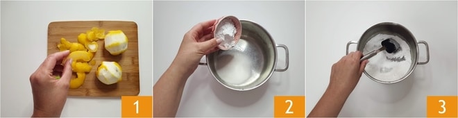 Para preparar la crema de limón sin huevos, lo primero que hay que hacer es lavar bien los limones y secarlos. Usando un pelador, sacad solo la cáscara, sin llevaros la parte blanca 1. En una cacerola, verted el azúcar y la maicena 2, mezclad con una espátula o una cuchara 3.