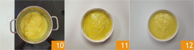 Mezclad y eliminad las cáscaras de limón 10. Pasad la crema a un bol 11, cubrid con film en contacto directo y dejad enfriar primero a temperatura ambiente y luego en la nevera antes de usarla 12. Para una crema más fluida, antes de usarla, trabajadla unos segundos con un batidor.
