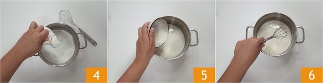 Verted la leche poco a poco 4 mezclando para que no se formen grumos. Añadid también la nata fresca 5 y mezclad de nuevo con un batidor 6.