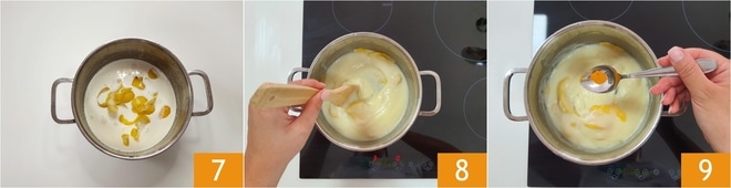 Añadid las cáscaras de limón 7 y coced la crema a fuego muy bajo, hasta que espese 8. Retirad del fuego y añadid una pizca de cúrcuma 9 para colorear la crema de amarillo.