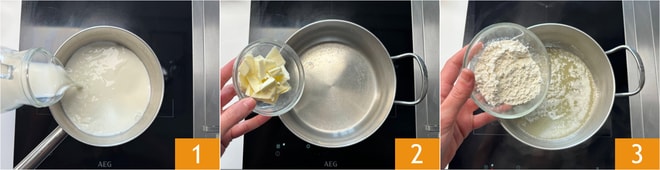Para preparar la crema de Parmesano, lo primero que hay que hacer es calentar la leche en un cazo 1, sin que llegue a hervir. En otra cazuela pon la mantequilla 2 y déjala derretir a fuego lento. Añade la harina poco a poco 3.