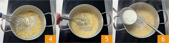 Mezcla con un batidor 4 hasta que el roux esté bien integrado y de color dorado 5. Vierte la leche caliente poco a poco 6 mezclando continuamente con el batidor para evitar la formación de grumos. Cocina a fuego lento hasta que la mezcla espese.