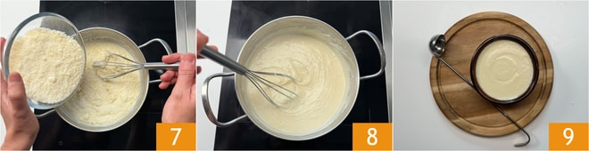 Apaga el fuego y añade el Parmesano rallado 7, poco a poco, mezclando continuamente con el batidor. Debes obtener una consistencia bastante densa 8, si tomas una cucharada de crema y la dejas caer en la cazuela, si permanece por unos instantes en la superficie antes de ser integrada, entonces la consistencia será la adecuada. Tu crema de Parmesano está lista para ser utilizada en tus preparaciones 9.