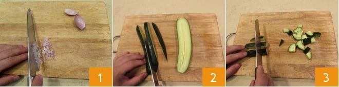 Para preparar la crema de pepinos y yogur empezad preparando el Caldo de verduras. Luego lavad y secad las verduras. A continuación, limpiad y picad finamente la chalota 1. Ahora despuntad los pepinos, sacad unas rodajas 2 y cortad estas últimas en pequeños daditos 3: reservad.