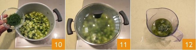 Añadid el eneldo 10 y cubrid con una tapa 11. Dejad cocinar a fuego lento durante aproximadamente 20-25 minutos. Transcurrido este tiempo, apagad el fuego y dejad templar. Transferid a un recipiente de bordes altos 12.