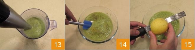Batid con una batidora de mano hasta obtener una crema homogénea 13. Verted la crema en un cuenco grande, ajustad de sal y pimienta 14 y rallad una cáscara de limón no tratada 15.
