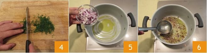 Ahora picad finamente también el eneldo 4 y reservad. Ahora todo está listo para la preparación. Tomad una cacerola antiadherente de bordes altos. Sofreíd la chalota con un poco de aceite 5. Mezclad de vez en cuando para una cocción uniforme hasta que esté dorada. Luego rociad con un cucharón de agua 6.