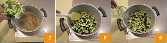 Añadid los daditos de pepino 7 y cocinad durante algunos minutos mezclando con una espátula 8. Ahora añadid el caldo vegetal caliente 9.
