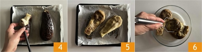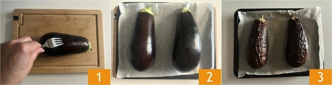 Para preparar la crema de berenjenas, lávalas, colócalas sobre una tabla y pínchalas con un tenedor 1; este paso es esencial para evitar que exploten durante la cocción. Una vez preparadas ambas, transfiérelas a una bandeja cubierta con papel de horno 2, sin añadir nada. Hornéalas a 200° en modo estático durante unos 45 minutos, en la guía central del horno 4.