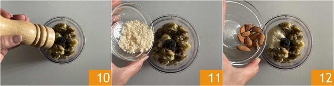 En este punto añade una pizca de sal, una pizca de pimienta 10, el parmesano rallado 11 y las almendras 12.