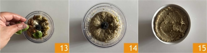 Agrega a continuación la albahaca 13, luego cierra la batidora y tritura todo hasta obtener una crema homogénea 14. Transfiere a un bol pequeño 15.