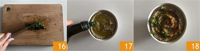 Toma luego el perejil y pícalo finamente 16. Enriquece la crema de berenjenas con un chorrito de aceite 17, el perejil picado finamente y una pizca de guindilla 18. ¡Sírvela inmediatamente o consérvala en el frigorífico!