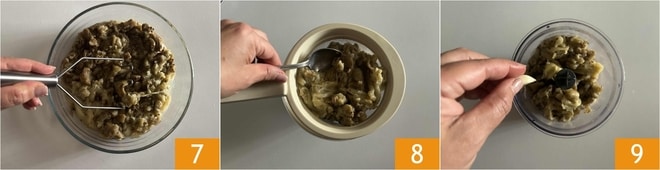 Luego aplástalas ligeramente 7 con el utensilio adecuado o con un tenedor. Traslada la pulpa de las berenjenas a un colador con un bol debajo, presiona ligeramente con una cuchara para que salga el exceso de agua de vegetación 8. Luego transfiere a una batidora y añade el diente de ajo pelado 9.