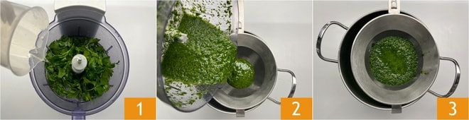 Para preparar la crema de tupinambo con vieiras salteadas, primero dedícate al aceite verde: coloca el perejil en una licuadora, luego vierte el aceite de semilla 1 y licúa durante 5 minutos. Filtra la crema obtenida con un colador de malla fina 2 y coloca debajo un bol para recoger el líquido. Guarda el colador y el bol en el frigorífico y deja filtrar durante 4 horas 3.