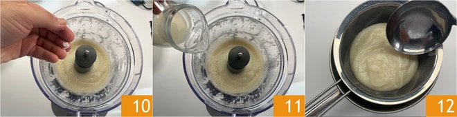 Ahora transfiere la pulpa del tupinambo a la licuadora y licúa a alta velocidad durante 3 minutos. Ajusta de sal 10, añade la leche de almendras 11 y licúa nuevamente durante al menos 5 minutos, hasta obtener una crema suave. Tamiza la crema a través de un colador 12.