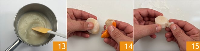 Recoge la crema de tupinambo en un cazo 13, para poder calentarla justo antes de servir. Finalmente, prepara las vieiras: elimina el coral 14 y la parte más dura 15, luego colócalas sobre papel absorbente para secarlas.