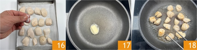 Sazona las vieiras por ambos lados 16. En una sartén antiadherente, derrite la mantequilla 17, luego coloca las vieiras y saltéalas durante 2 minutos por lado 18.