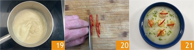 Calienta la crema de tupinambo 19. Mientras tanto, corta los pimientos por la mitad a lo largo y elimina las semillas, luego córtalos en juliana 20. Estás listo para emplatar: distribuye en el fondo un cucharón de crema de tupinambo, luego añade 5 vieiras por plato y decora con cebollino finamente picado y el pimiento. Completa con unas gotas de aceite de perejil y tu crema de tupinambo con vieiras salteadas está lista para ser servida 21!