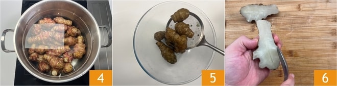 Pasa al tupinambo: coloca el tupinambo en una olla y cubre con abundante agua 4, luego cocina durante 3 horas, hasta que también la parte central esté suave. Apaga el fuego y deja templar en su agua, luego escurre los tubérculos 5 y córtalos por la mitad 6.