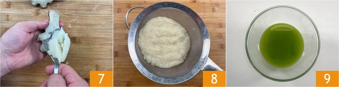 Extrae la pulpa con una cuchara 7 y colócala en un colador para eliminar el exceso de agua 8. Mientras tanto, saca el aceite verde del frigorífico y llévalo a temperatura ambiente 9.