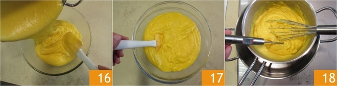 En cuanto empiece a hervir, apaga el fuego y transfiere la crema a un bol 16. Luego coloca este bol en un baño maría con agua y hielo. Mezcla cada 2-3 minutos para enfriarla. Cuando la crema esté fría, caliéntala en el microondas o a baño maría 18 hasta alcanzar una temperatura de 26°.