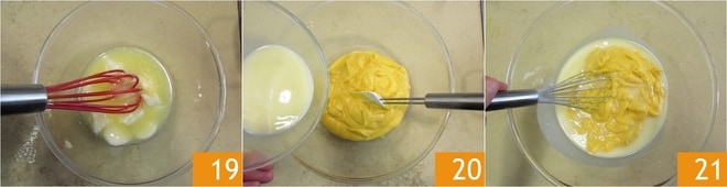 Mezcla con la batidora hasta obtener una especie de bechamel sin grumos 10. En este punto, añade las yemas 11 y mezcla con la batidora 12.