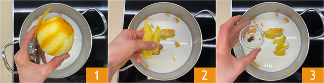 Para preparar la crema para panettone, primero calienta la leche en un cazo junto con la cáscara de naranja 1, la cáscara de limón 2 y las semillas de la vaina de vainilla 3.