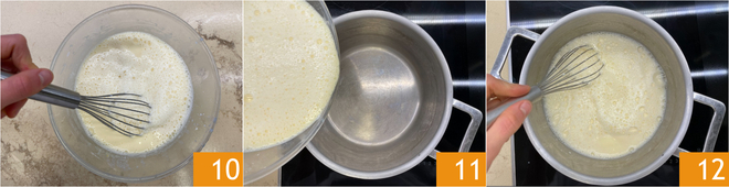 Deberás obtener una mezcla homogénea 10. En este punto, devuélvela al cazo 11 y deja que espese al fuego a llama media-baja, removiendo continuamente 12.