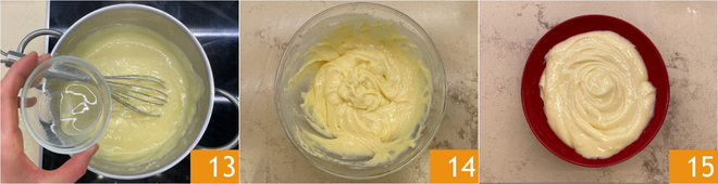 Una vez que la crema se haya espesado, apaga el fuego y aromatiza con el cointreau 13. Mezcla bien para integrarlo de manera homogénea. Transfiere la crema a un bol y deja enfriar completamente 14. ¡Tu crema para panettone está lista para ser disfrutada 15!
