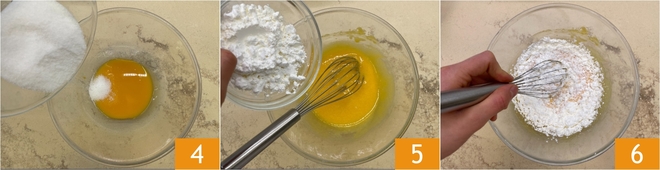 Mientras tanto, vierte las yemas y el azúcar en un bol 4 y mezcla con una batidora de varillas 5, luego añade el almidón de maíz 5 y mezcla de nuevo 6.