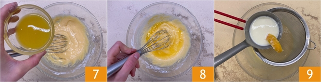 Incorpora el zumo de naranja 7 y mezcla con la batidora de varillas 8, luego vierte la leche caliente en varias veces, filtrándola a través de un colador 9.