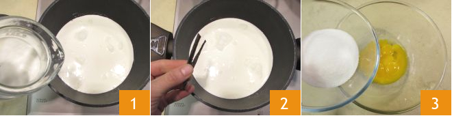 Para preparar la creme brûlée, primero viertan la leche y la nata en un cazo 1, agreguen la vaina de vainilla 2 y las semillas. Luego lleven suavemente a ebullición. Mientras tanto, pongan las yemas en un bol junto con el azúcar 3.
