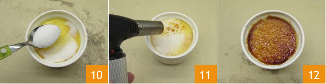 Una vez retiradas las cocottes del horno, déjenlas enfriar a temperatura ambiente y luego colóquenlas en el frigorífico. Al momento de servirlas, espolvoreen la superficie con azúcar 10 y utilicen un soplete para obtener una costra crujiente y caramelizada 11. Como alternativa, pueden poner las cocottes en el horno bajo el grill durante unos minutos. ¡Sus creme brûlées están listas para ser degustadas 12!